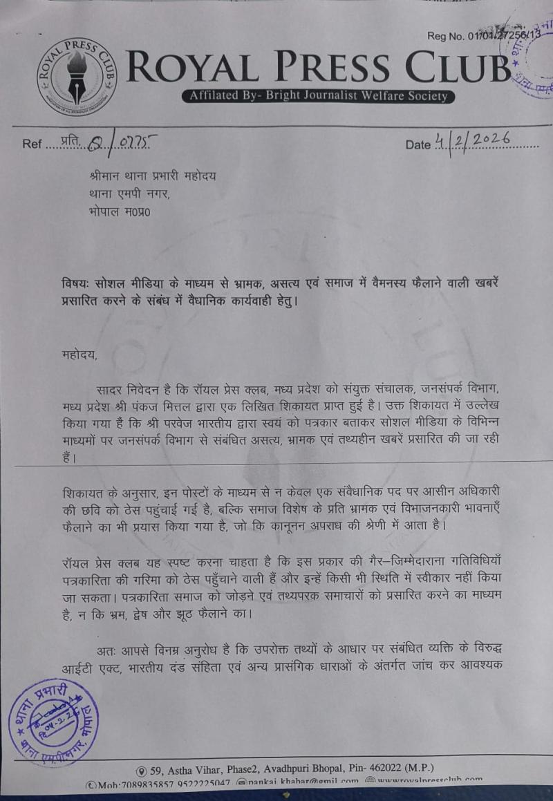 जनसंपर्क अधिकारी पर दबाव और झूठे आरोपों का मामला: रॉयल प्रेस क्लब ने एमपी नगर थाने में दी शिकायत