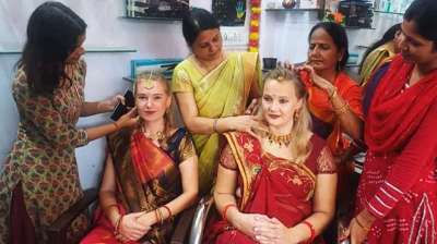 अजमेर की तीर्थ नगरी पुष्कर में रूप चौदस पर विदेशी युवतियों ने भी किया श्रृंगार, ब्यूटी पार्लरों पर रही चहल-पहल
