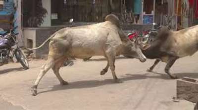 दो आवारा सांडों की बाजार में लड़ाई